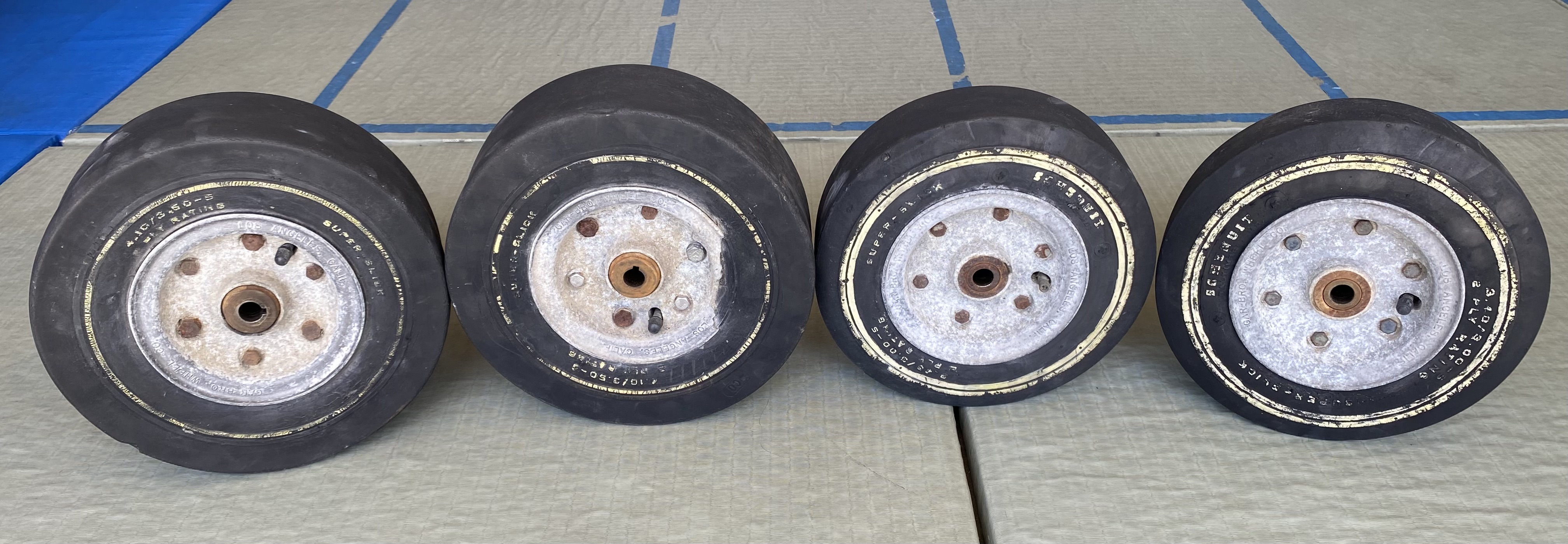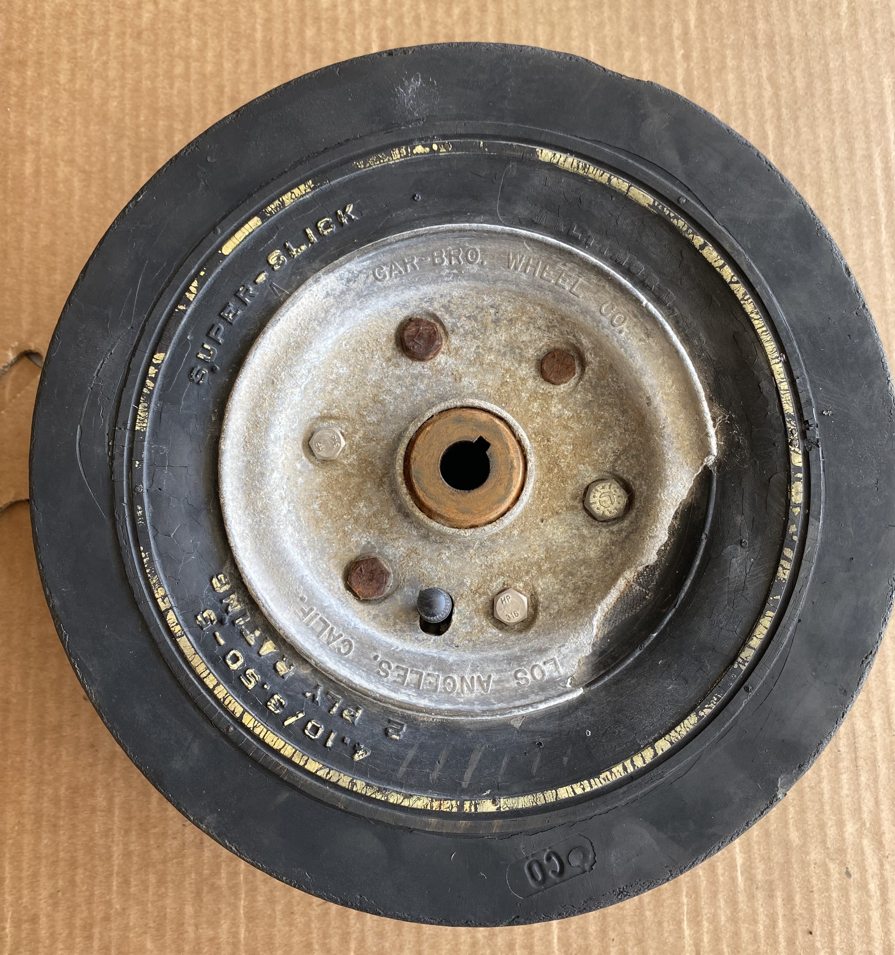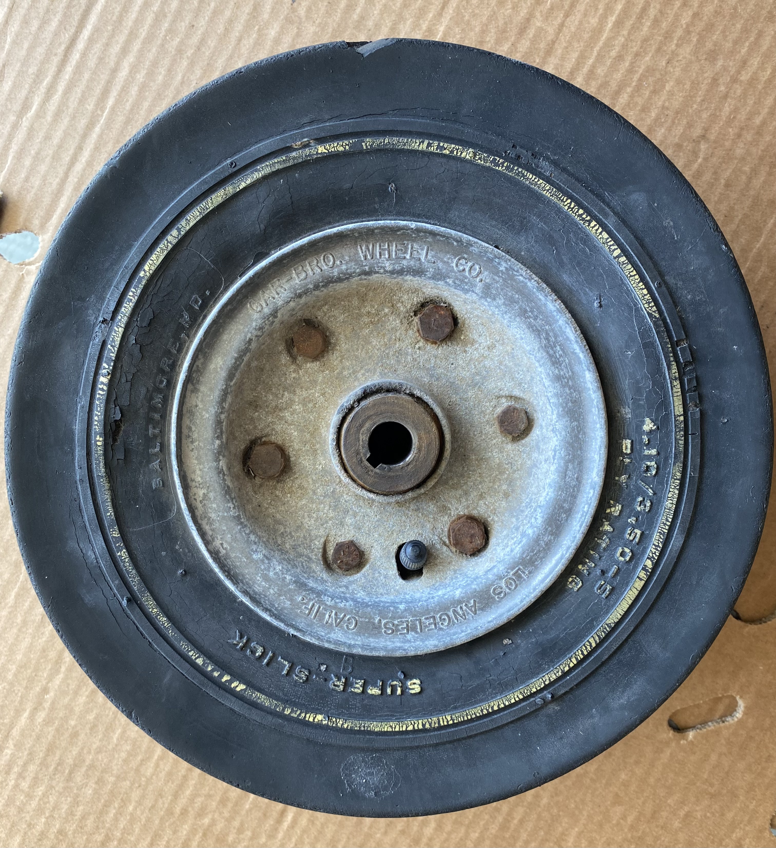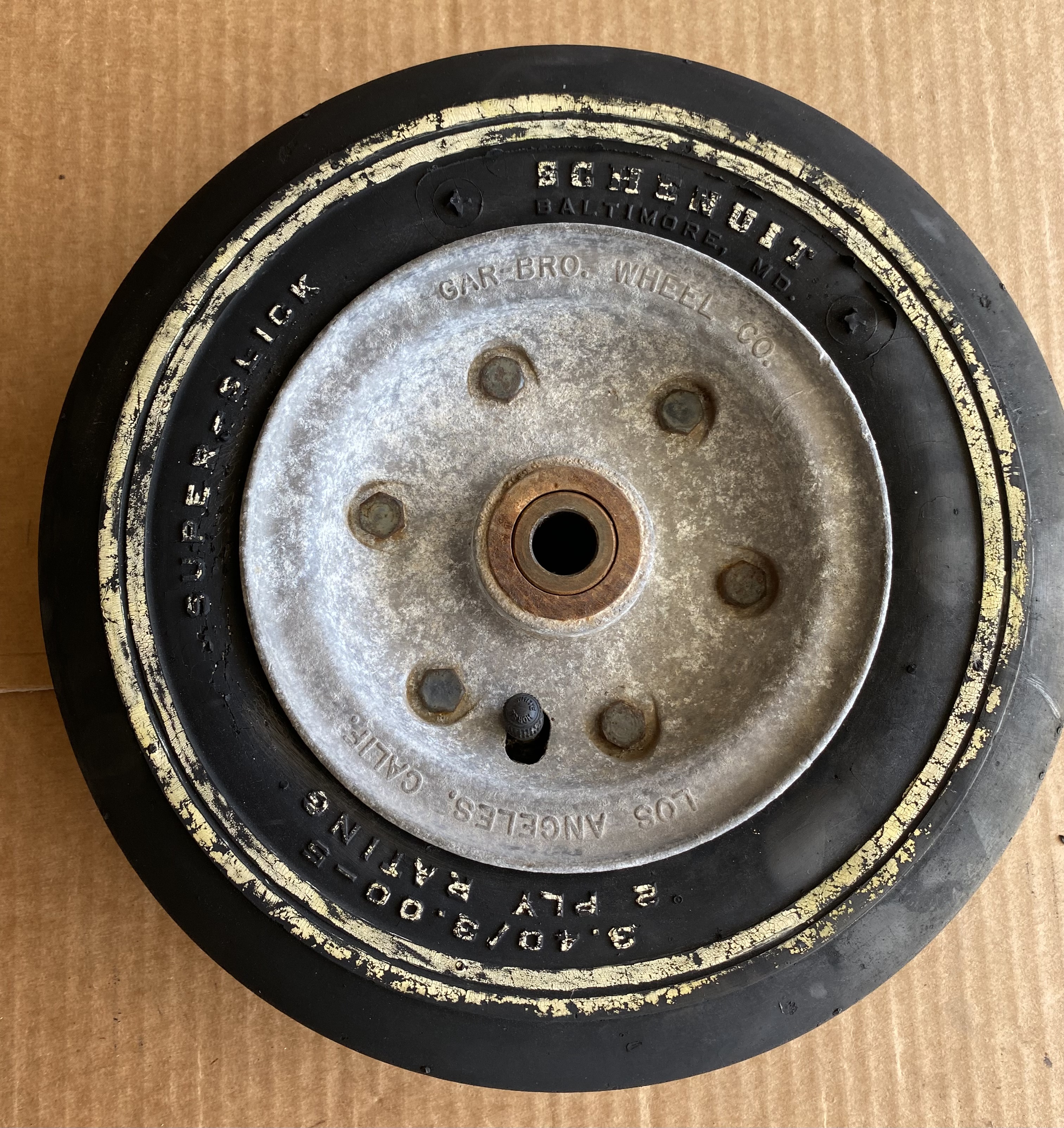 Selling a complete set of 1959 GAR-BRO wheels. There is a chip on outside of rear wheel that needs to be repaired. The chip does not affect any of the lettering.